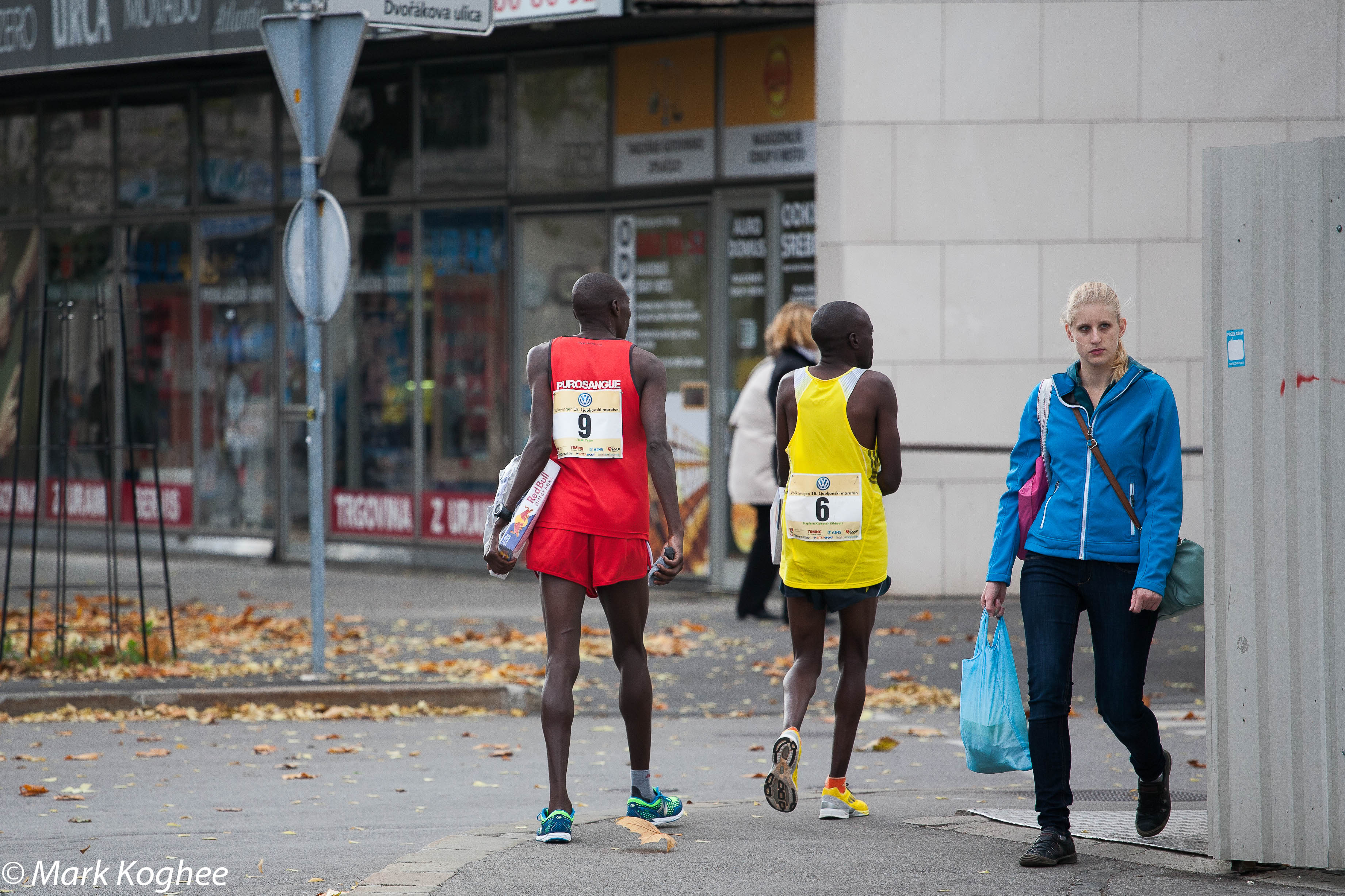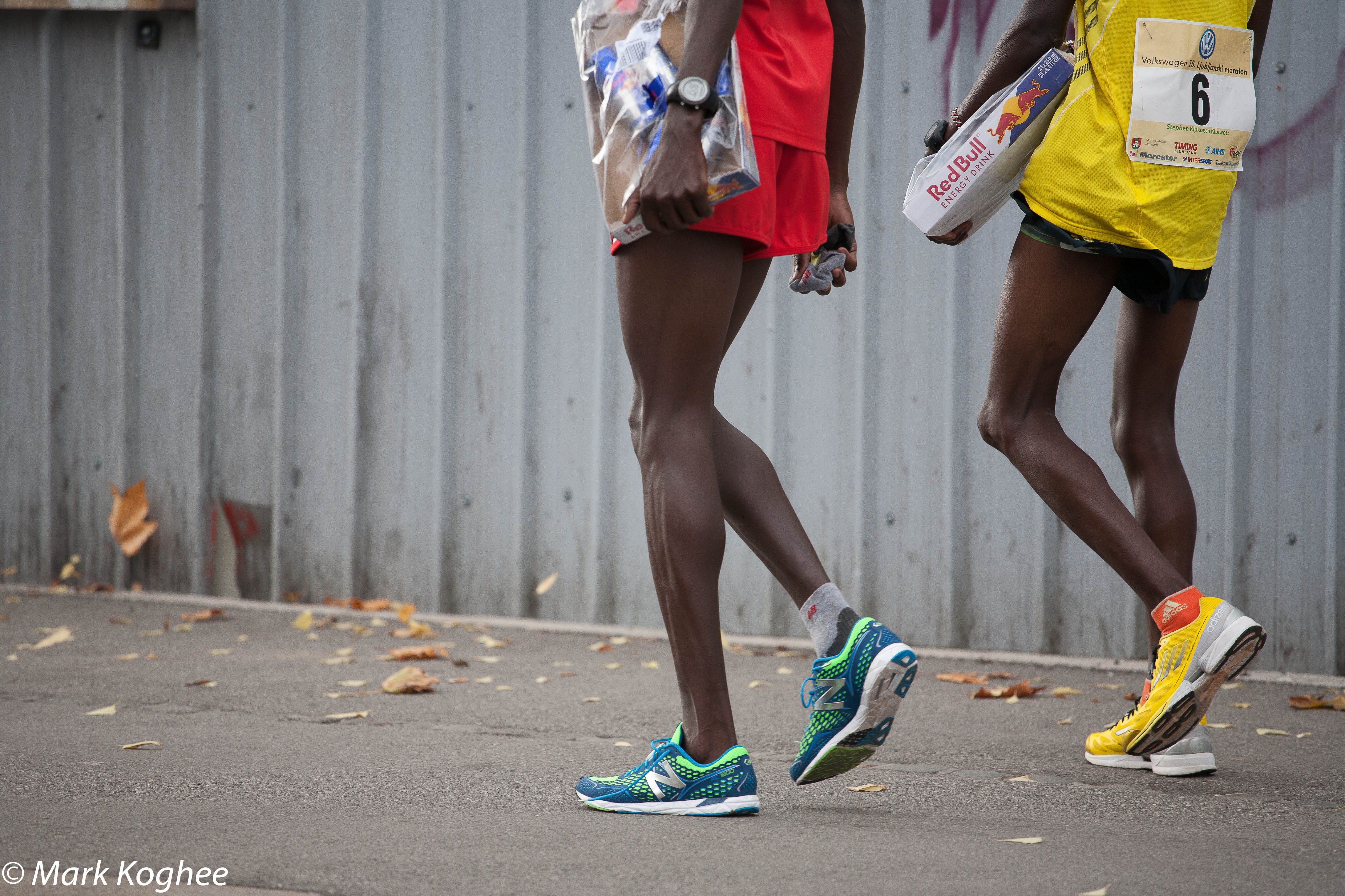 At half past ten in the morning of the 27th of October Yator and Kipkoech Kibiwott started in the Ljubljana Marathon and now, at two thirty, they walk on the pavement behind the spectators, while on the road thousands of recreational runners battle a headwind in the last kilometers of the marathon. Yator carries a box with 6 cans of Red Bull beverage in his left hand. In his right hand he holds the sock of his left foot. Kipkoech Kibiwott holds a box of Red Bull with two hands. They only wear a singlet and shorts and the wind gave their skin goose bumps.