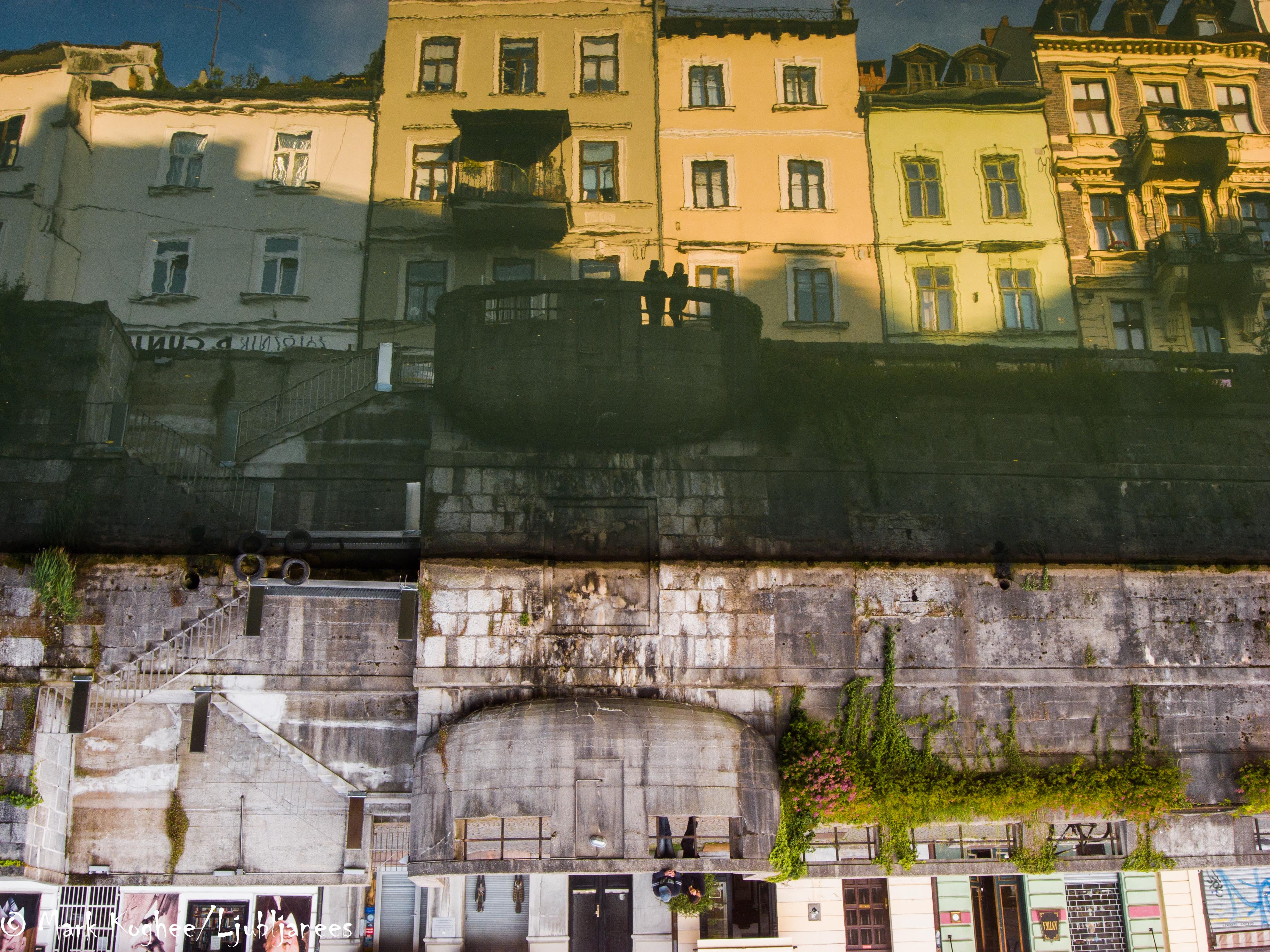 The world’s first prototype mobile phone was presented in 1973. It was a Motorola and it weighed a kilogram. It wouldn’t have been very comfortable to ride a bike while using that phone. The phone in this girl’s hand is hardly visible.Stiropor is polystyrene and is used for isolation or the protection of goods (the white foamy stuff you sometimes find in the box). It’s also the name of a new contemporary music festival in Ljubljana. The girl on the kick scooter won’t be interested in either and doesn’t miss a thing while she races past.If you turn your screen 180 degrees you can see what this place looks like from the water up. Or just scroll down.The two people on the balcony look: a. At their own reflection b. At the reflection of the buildings c. They don’t see a reflection
