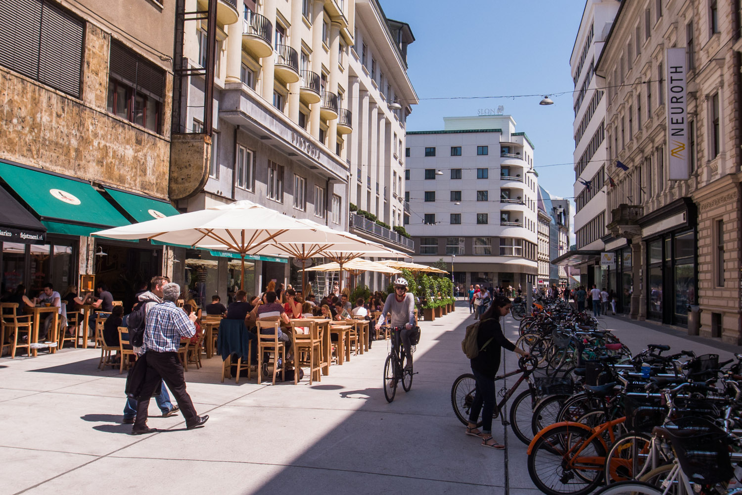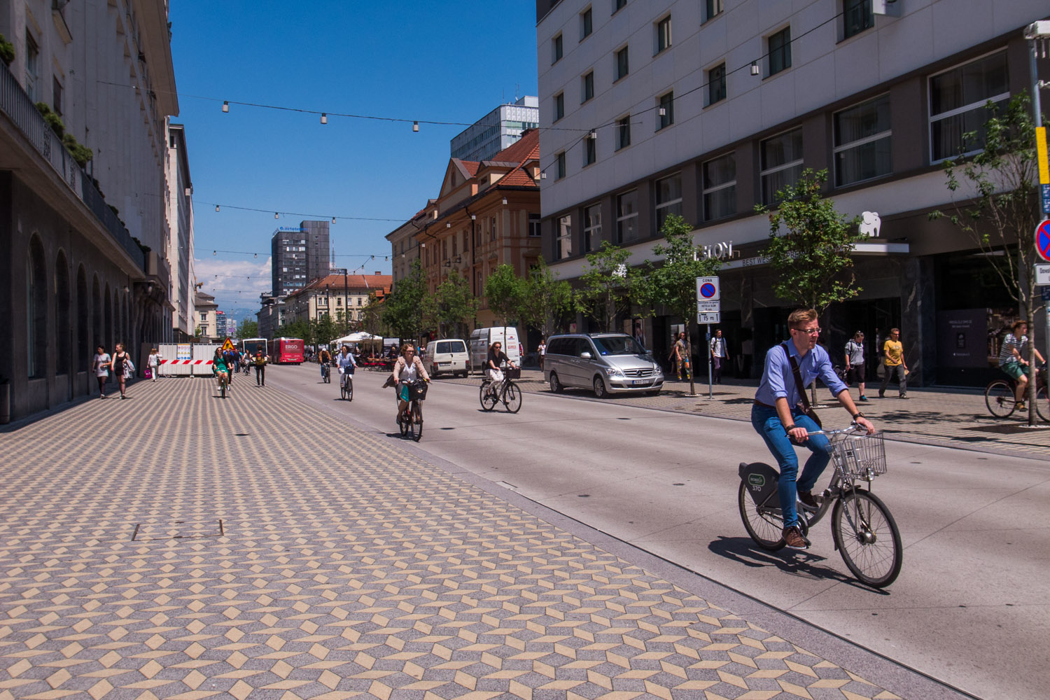 The bike is becoming more popular in Ljubljana. Part of Slovenska Cesta is now closed for motorized traffic (except public transport and cars with permission). It would be great to see this at more places in the city. A street without cars looks so much better than a street with cars.